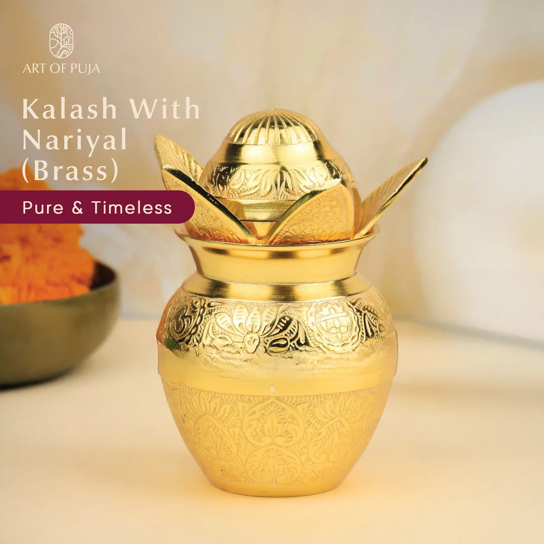 Brass Kalash with Nariyal & Lotus Leaves Lid A Symbol of Shubh Aagman 6.3 inch