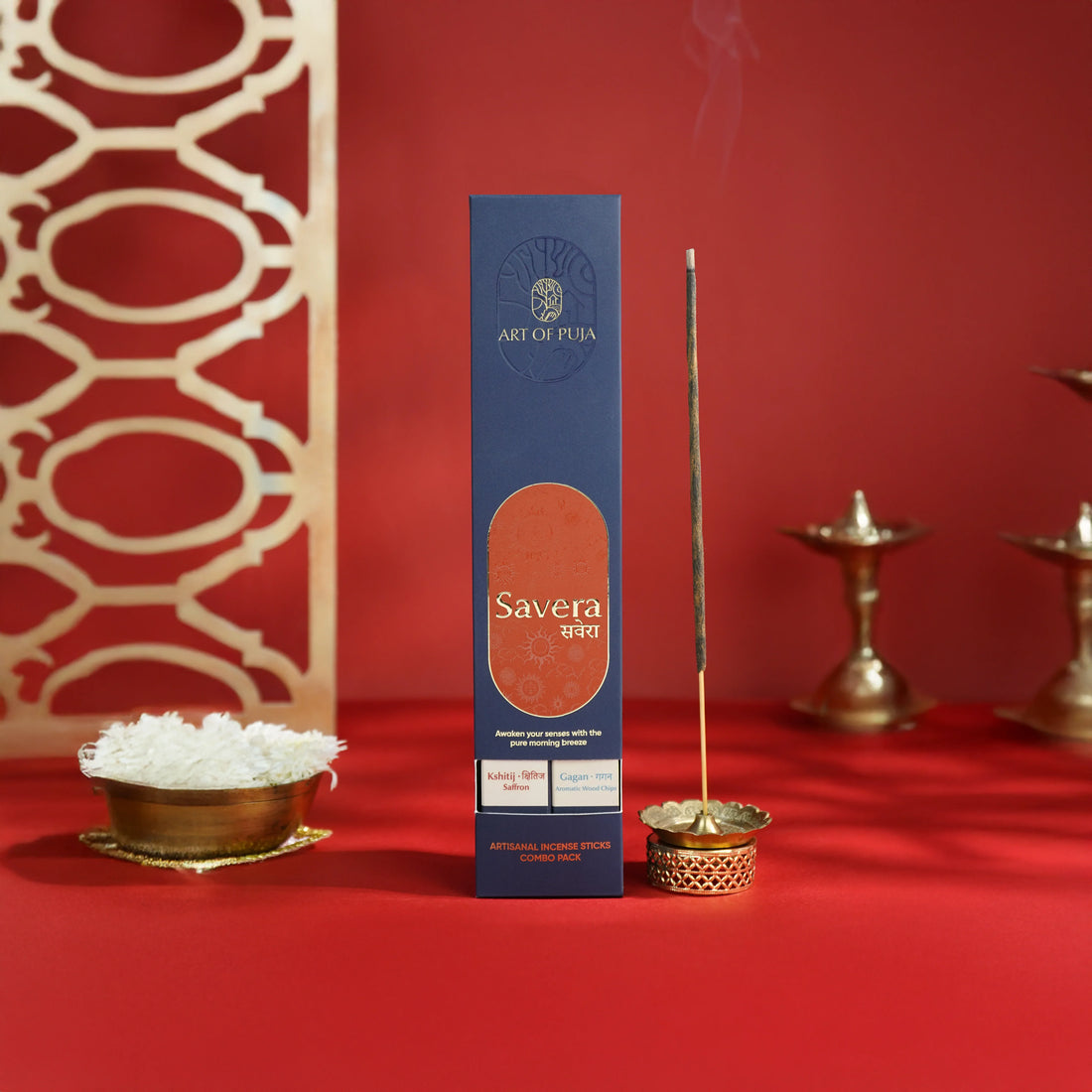 Savera Artisanal Incense Sticks (Combo Pack of 2) | Kshitij (Saffron) & Gagan (Aromatic Wood Chips)