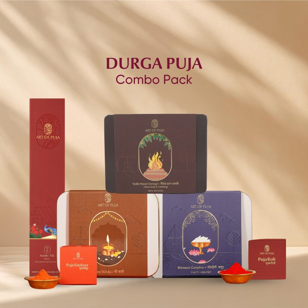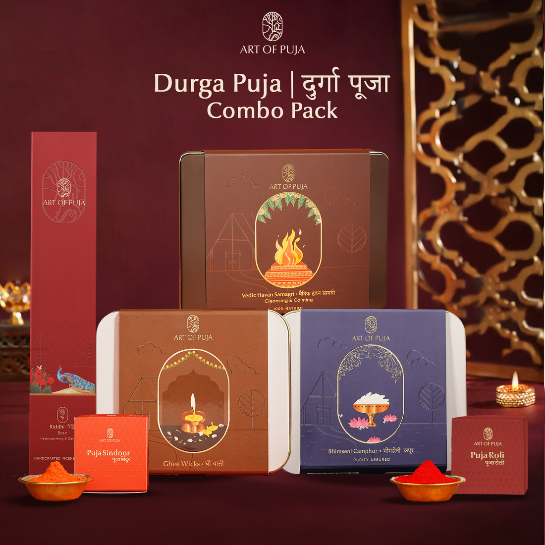 Durga Puja Combo | Ghee Wicks, Vedic Havan Samagri, Rose Incense, Bhimseni Camphor, Puja Roli & Sindoor
