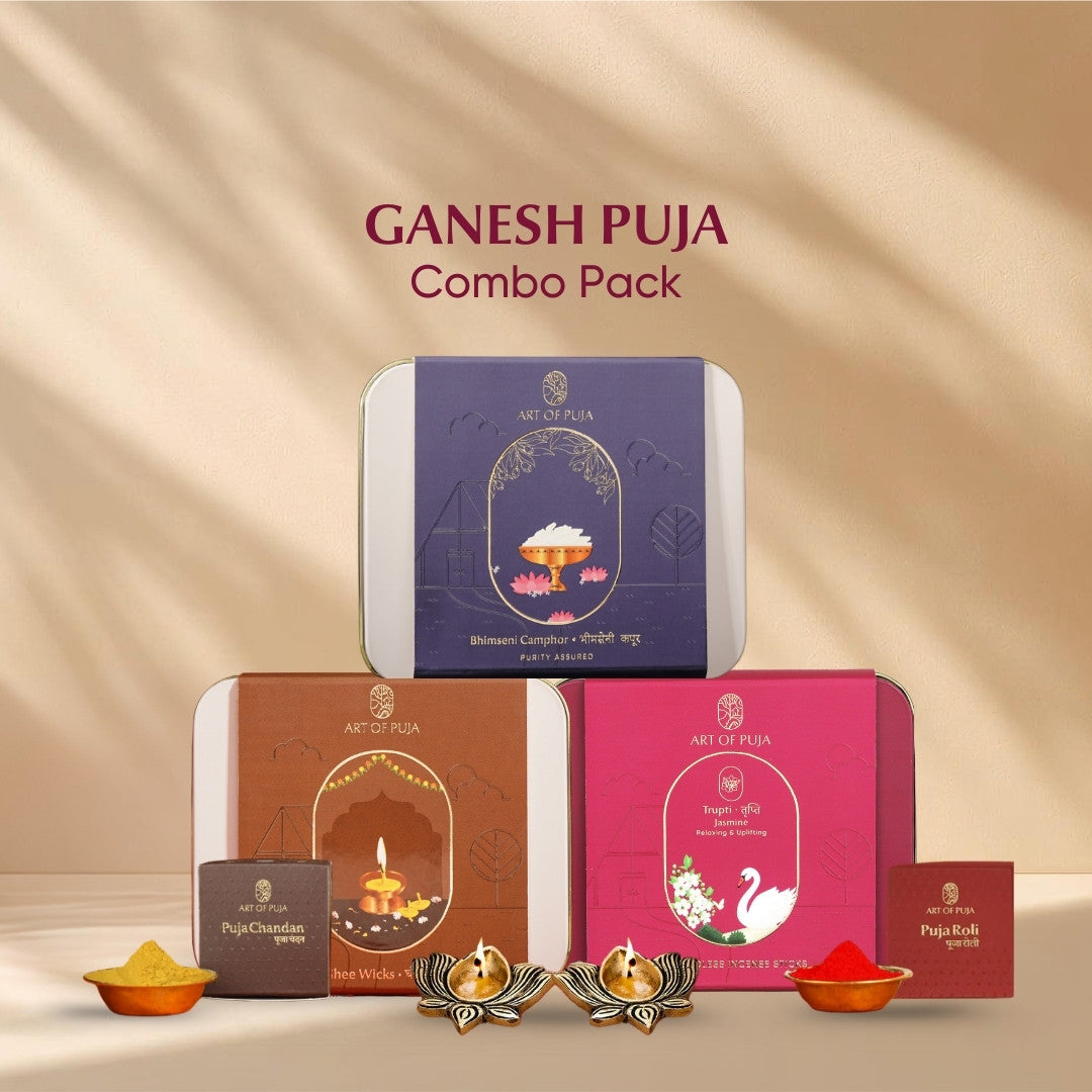 Ganesh Puja Combo | Ghee Wicks, Brass Diyas, Jasmine Incense, Bhimseni Camphor, Puja Roli & Chandan