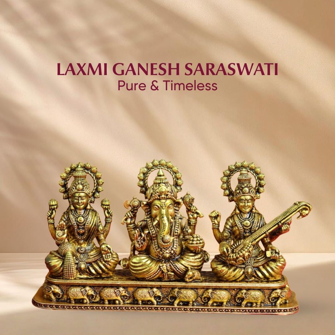 Brass Lakshmi Ganesha Saraswati Idol Set – Divine Trio Statue for Puja, Home Temple, Diwali & Auspicious Gifting