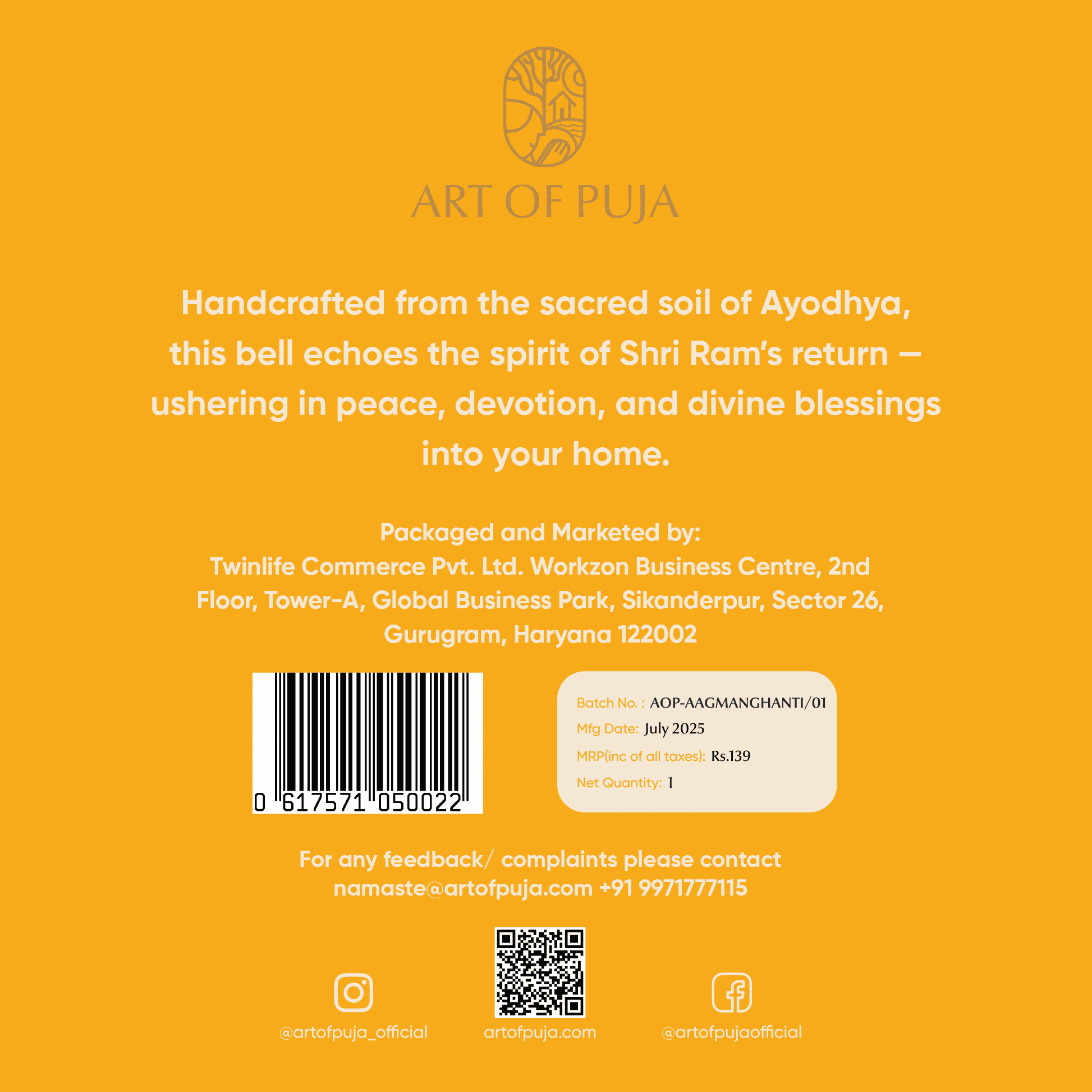 Ring in blessings this Diwali with the AAGMAN Ghanti, a sacred bell handcrafted from Ayodhya’s holy soil and detailed with a graceful 22K gold line finish. Every chime carries the spirit of Ayodhya—the city of Lord Ram—inviting peace, prosperity, and divine energy into your home.