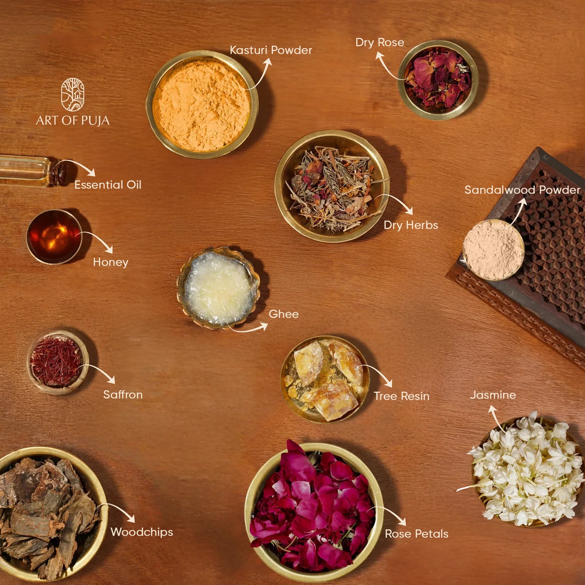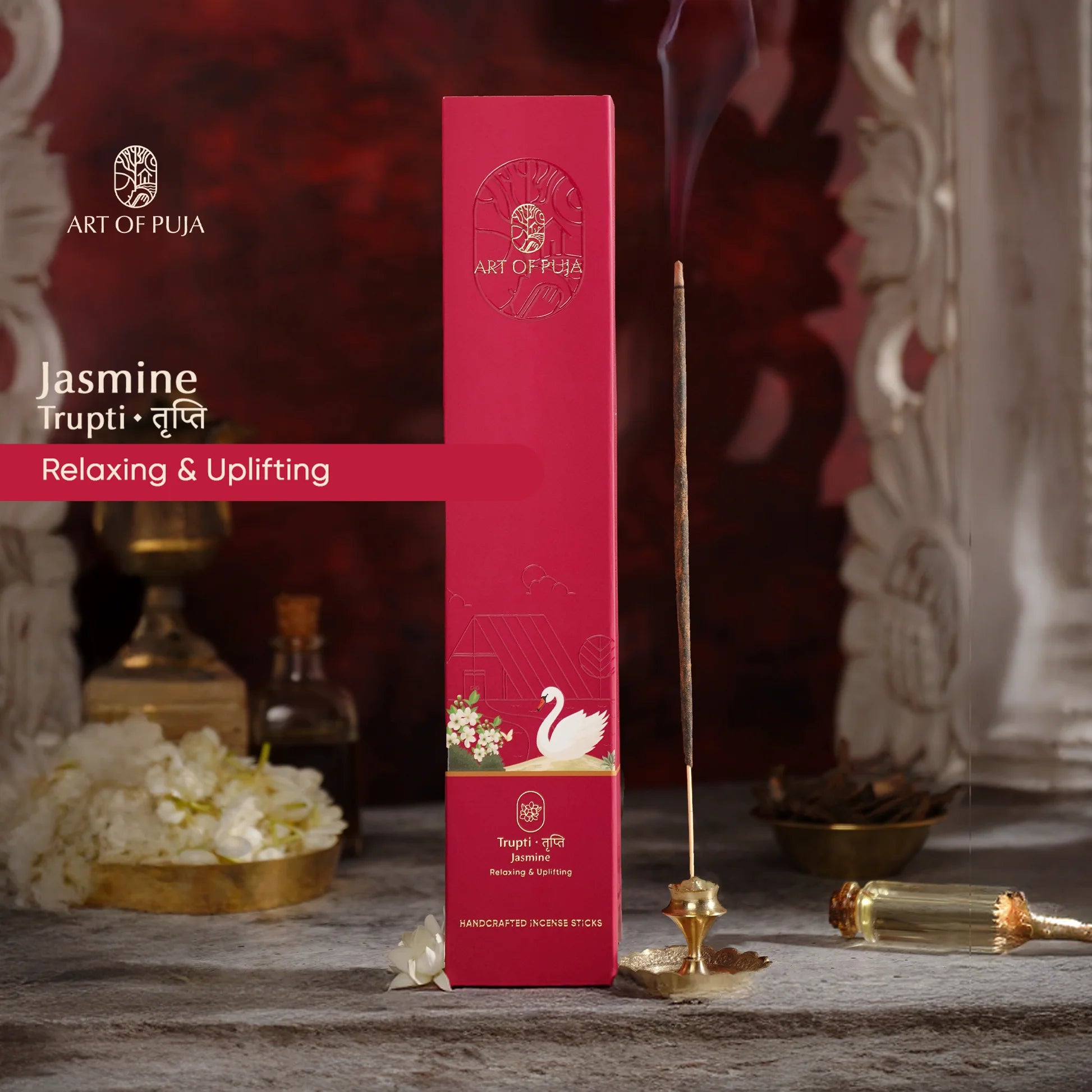 Jasmine (Trupti): Relieves stress, uplifts the mood, and promotes spiritual alignment