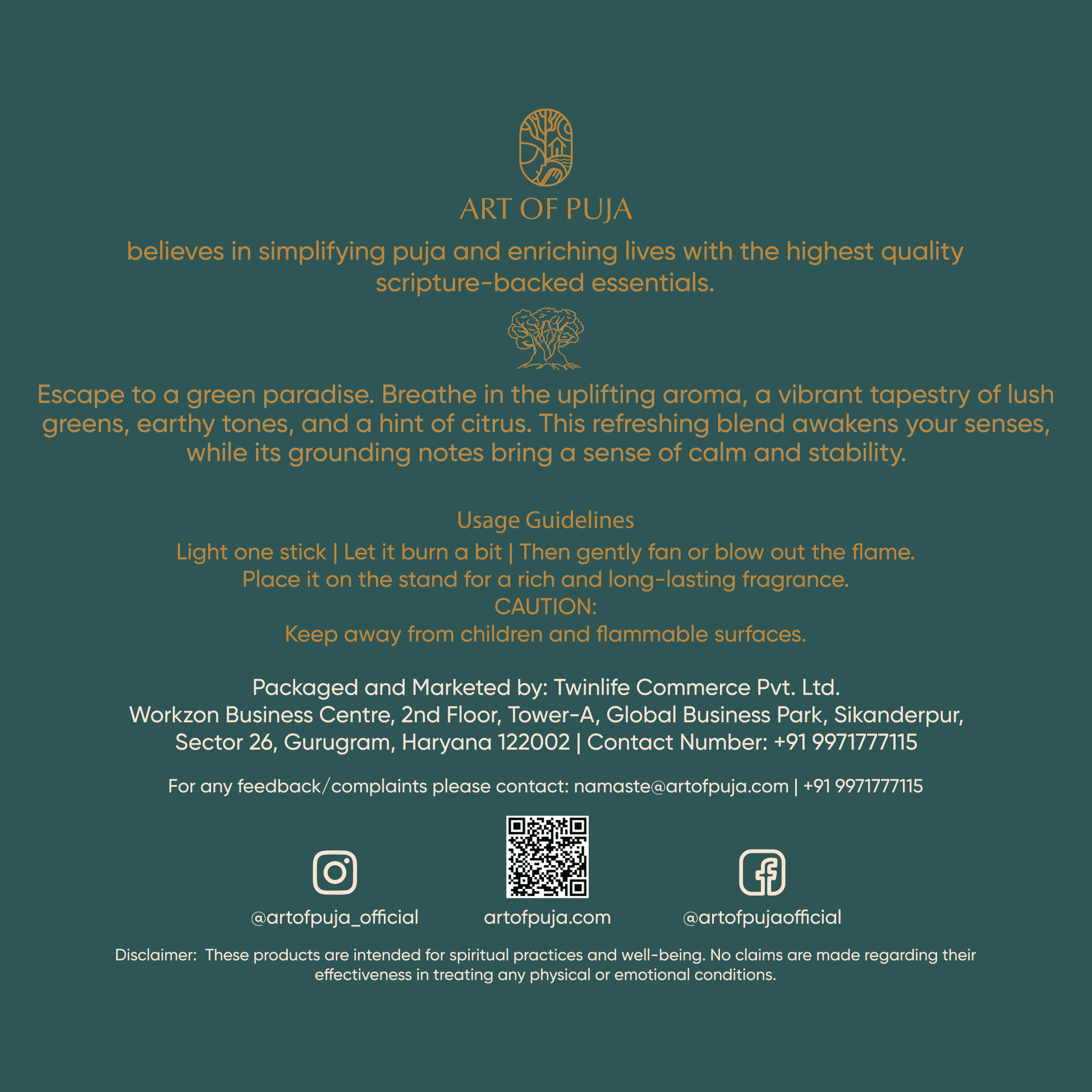 As you light these incense sticks, let the grounding, earthy notes transport you to a serene oasis, where stress melts away and your connection with the divine deepens. The invigorating top notes awaken your senses, leaving your home infused with freshness, positivity, and festive harmony.