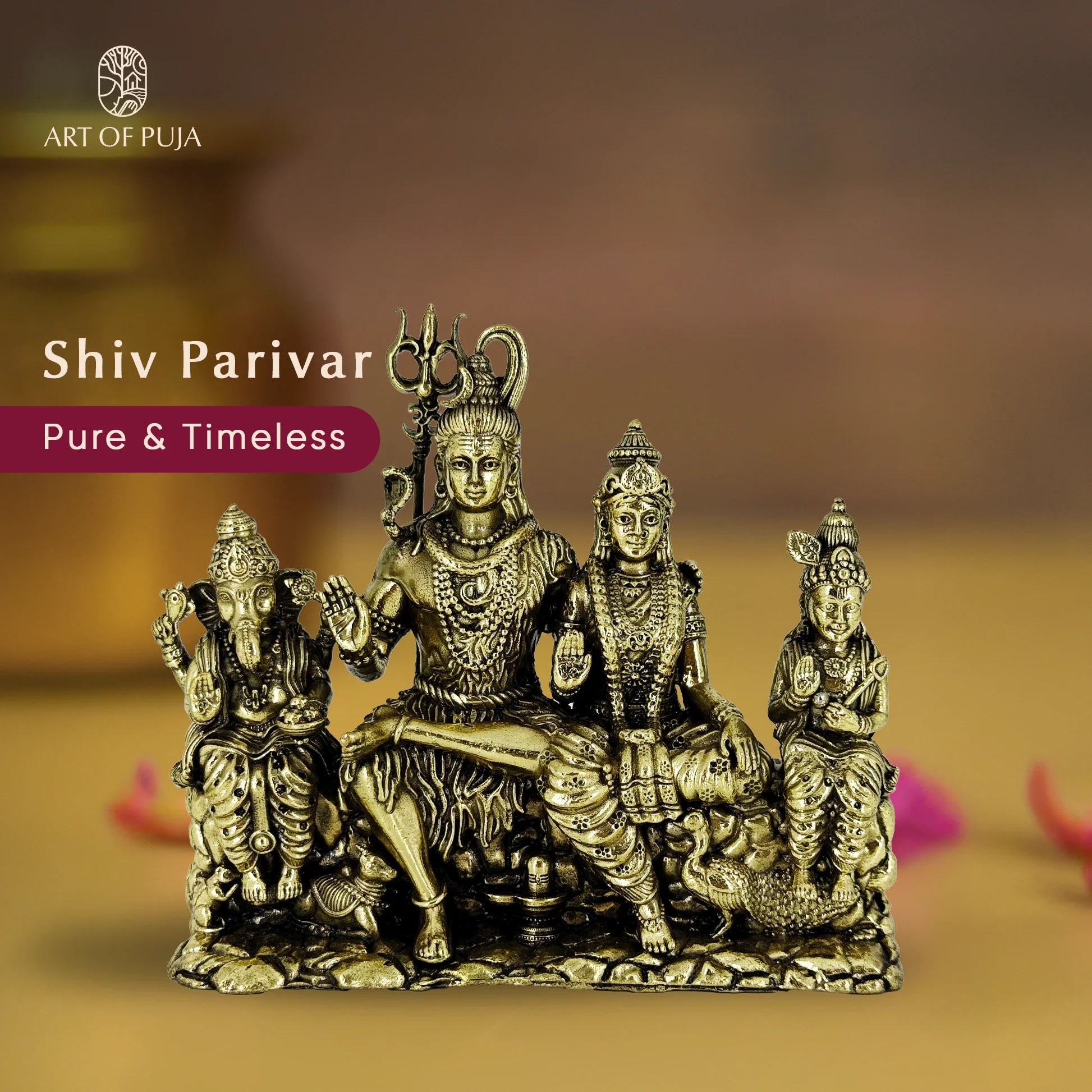 Every figure is finely sculpted in pure brass — Shiva in calm strength, Parvati in graceful poise, Ganesha in childlike wisdom, and Kartikeya in valorous stance. Alongside them, Nandi the bull and Mushak the mouse complete this celestial family, symbolizing loyalty, service, and humility.