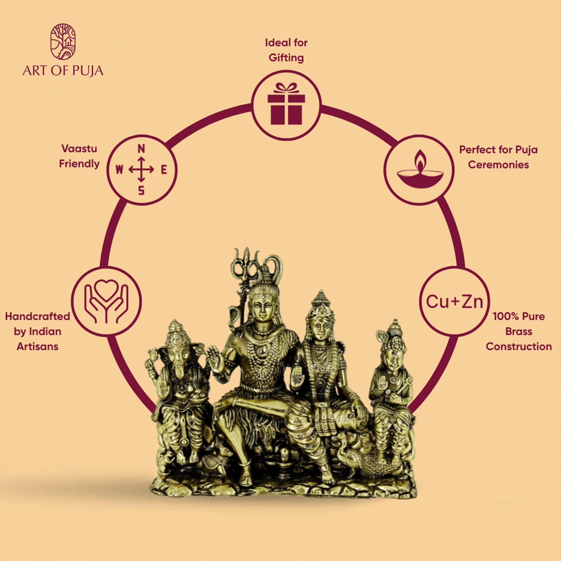 Placing this Shiv Parivar brass idol in your home temple or vastu space brings balance, protection, and a deep sense of completeness — uplifting your home with unity, peace, and divine blessings.
