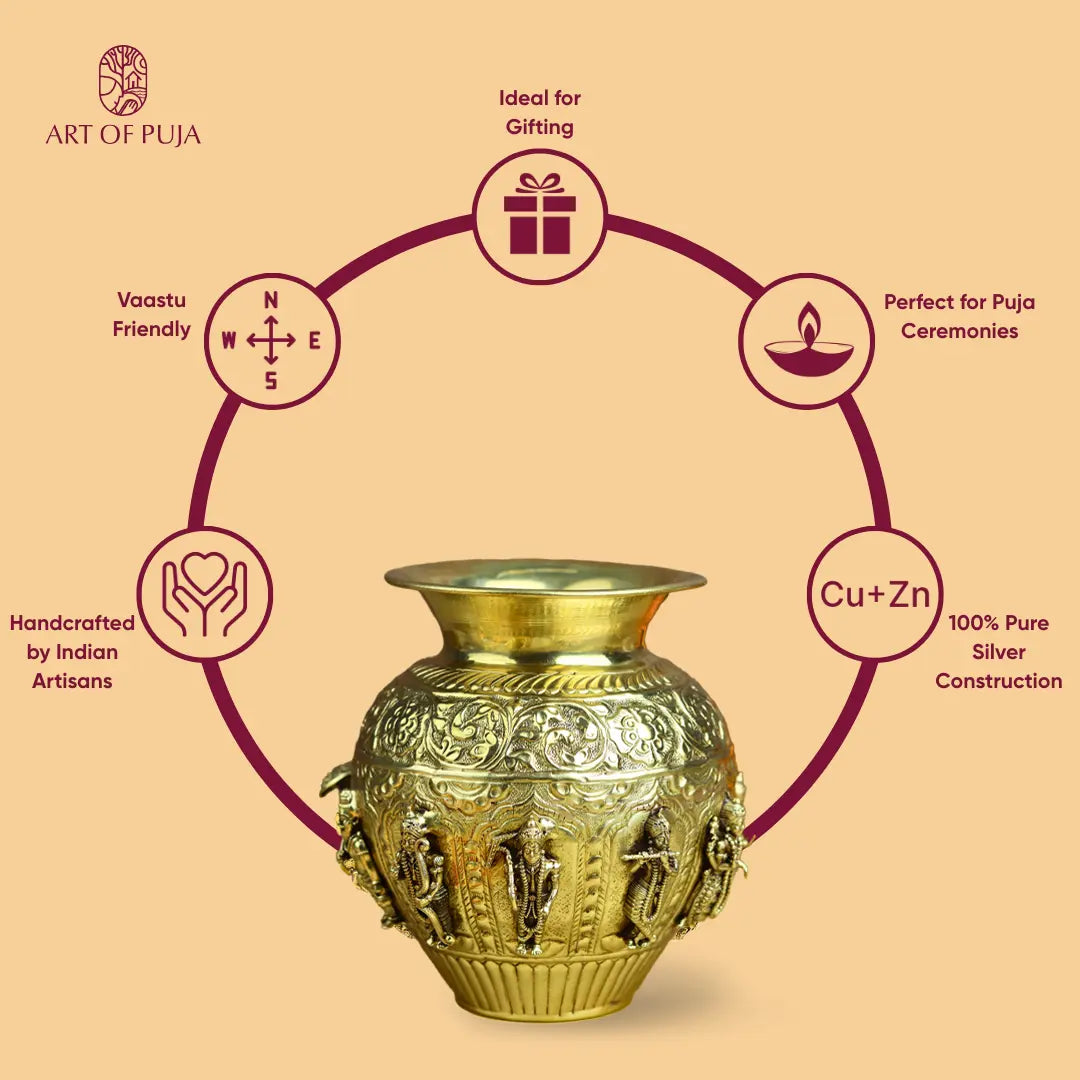 Introducing the Vishnu Dashavatar Kalash — a resplendent brass vessel engraved with the ten incarnations (avatars) of Lord Vishnu, symbolizing the cosmic balance between creation, protection, and transformation. Each avatar, from Matsya to Kalki, is meticulously hand-carved onto the kalash, turning this sacred vessel into a timeless spiritual relic.