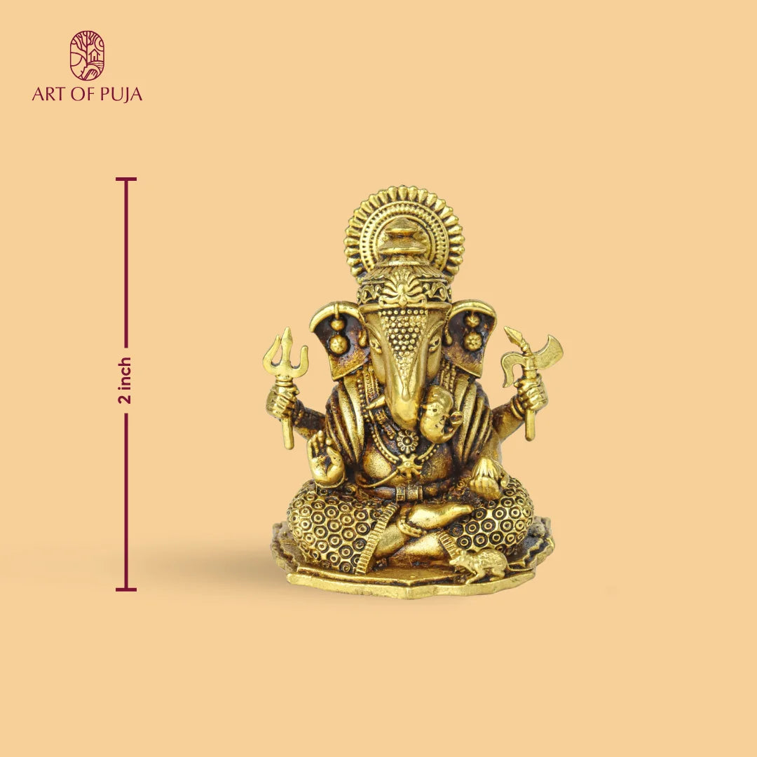 Brass Ganesh Ji Idol | Ganesha Murti with Trishul, Modak & Mushak | Vighnaharta Statue for Puja, Vastu & Prosperity | 2 inch