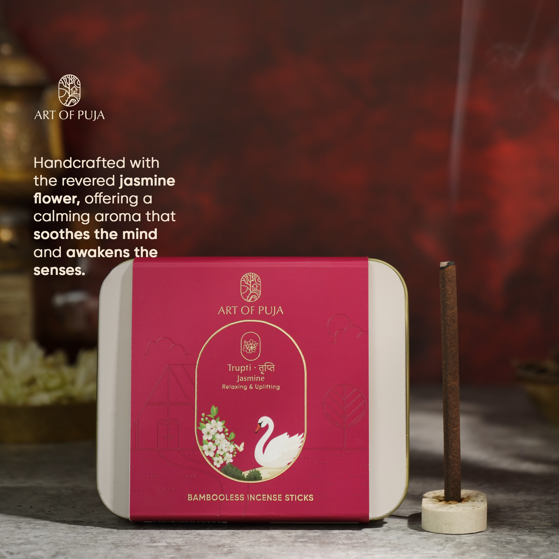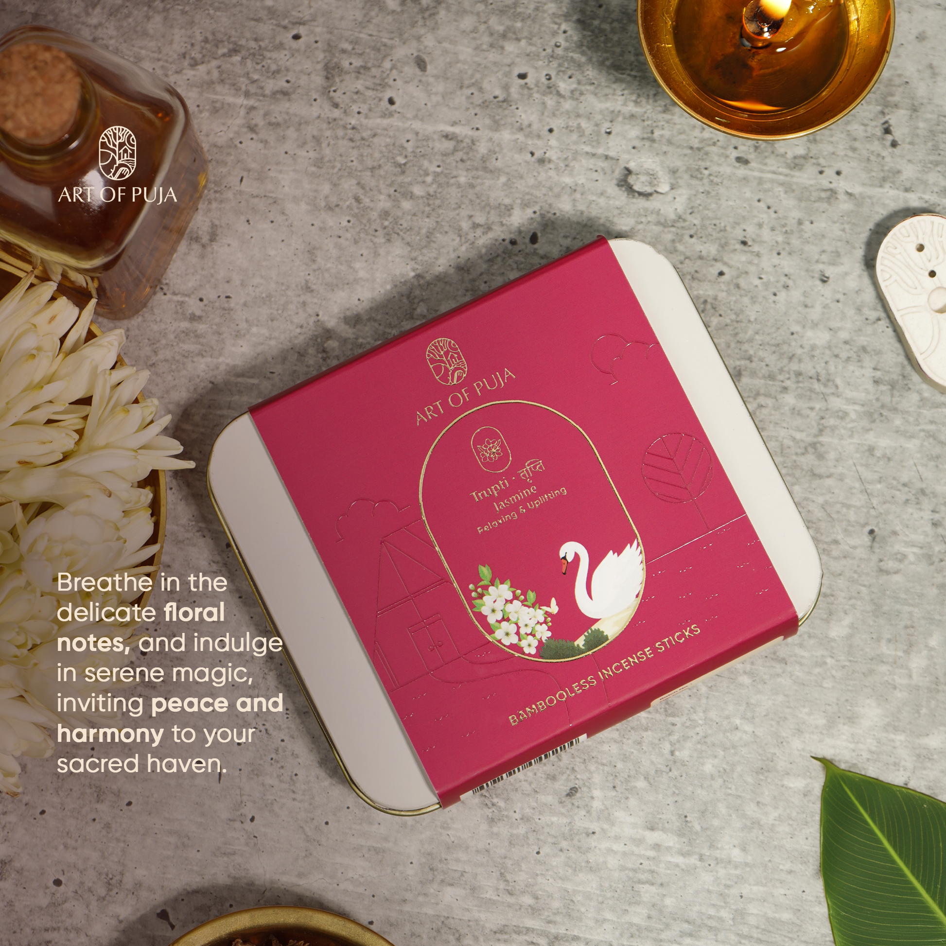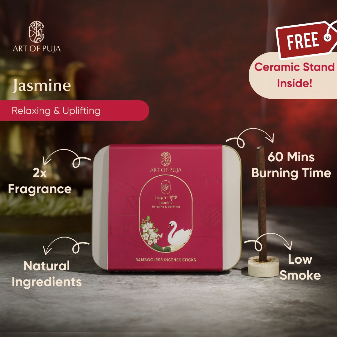 Art of Puja presents bambooless Jasmine incense sticks, where each stick is a fragrant masterpiece, imbued with the essence of purity and grace. Jasmine, a revered flower in ancient traditions, is renowned for its ability to soothe the mind and awaken the senses. Breathe in the delicate floral notes and allow them to foster a sacred communion between your inner spirit and the higher power. Experience a profound sense of tranquility as your spirit connects with something greater than yourself. Indulge in this serene magic, and let the worries of the world melt away, replaced by a sense of peace and harmony.
