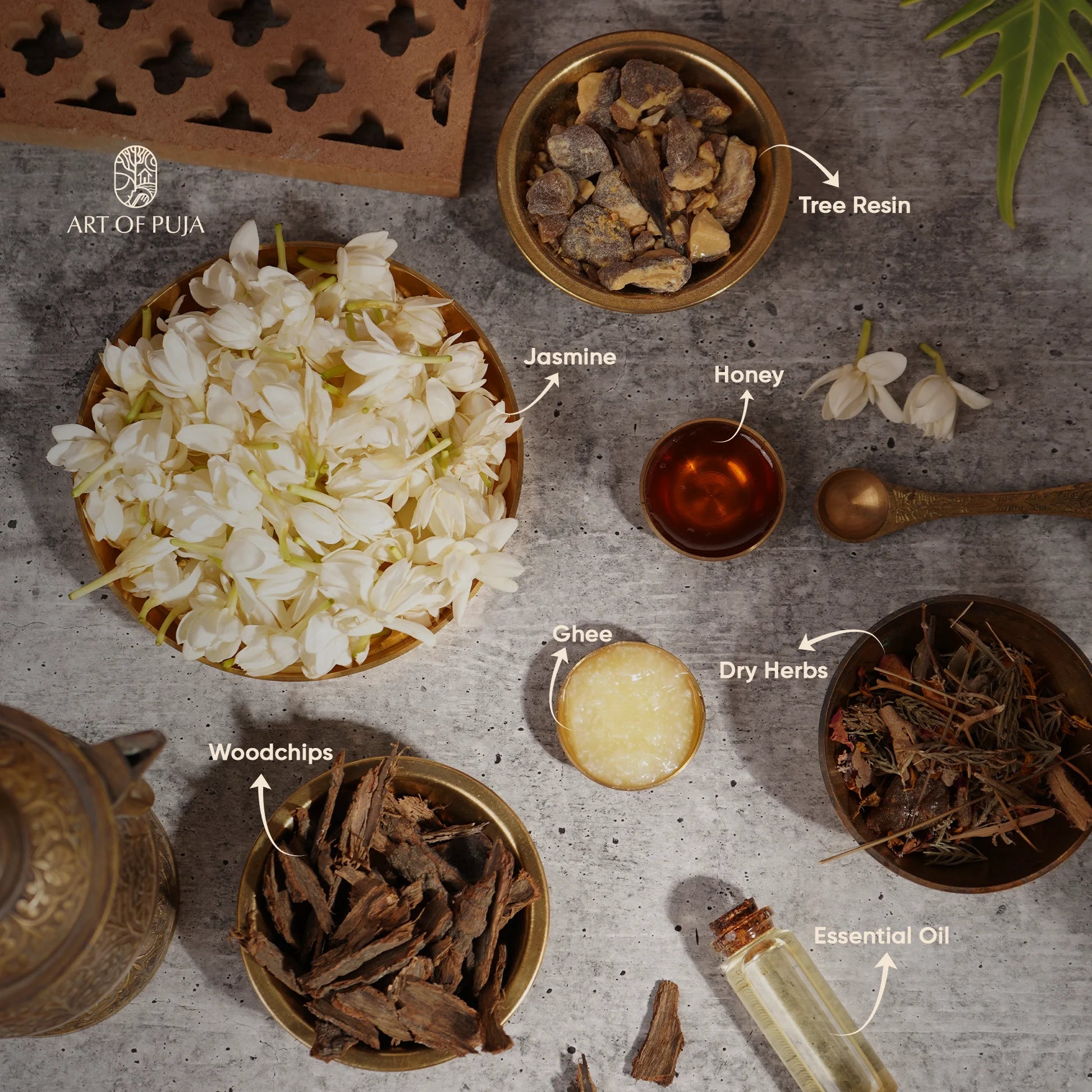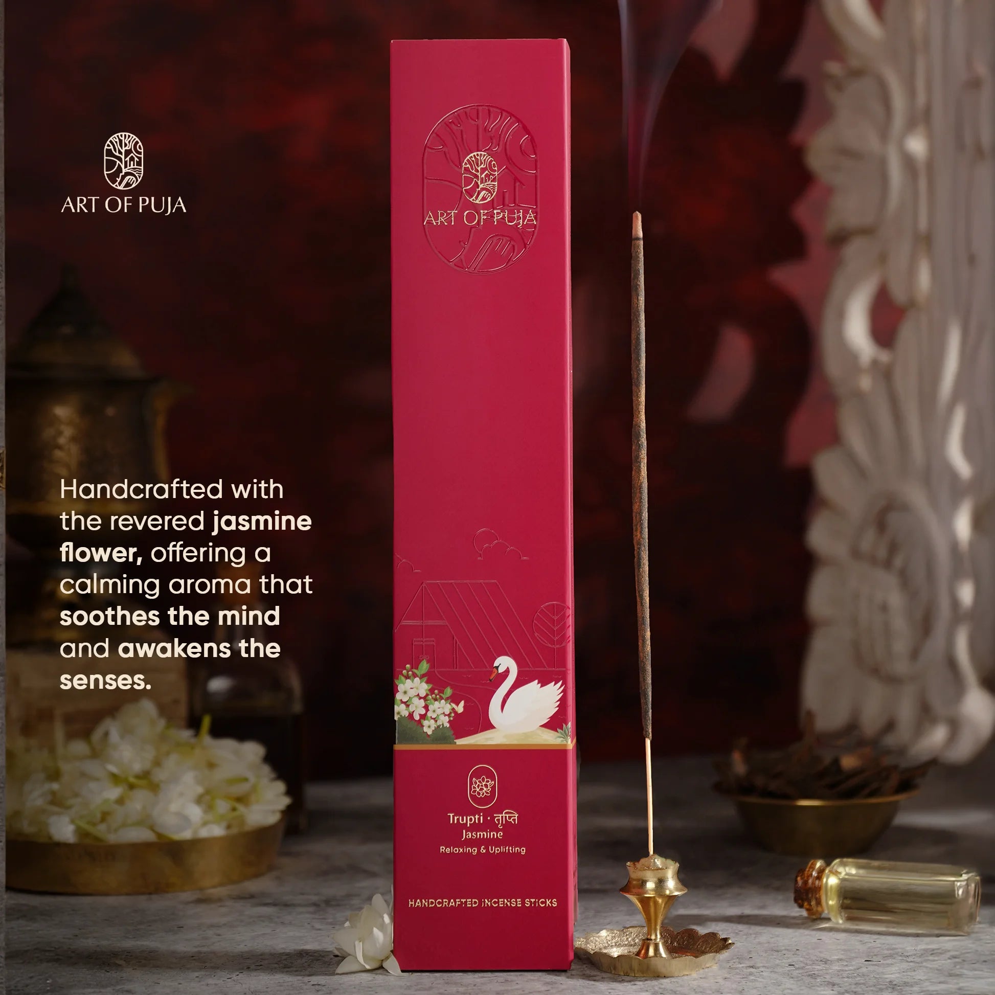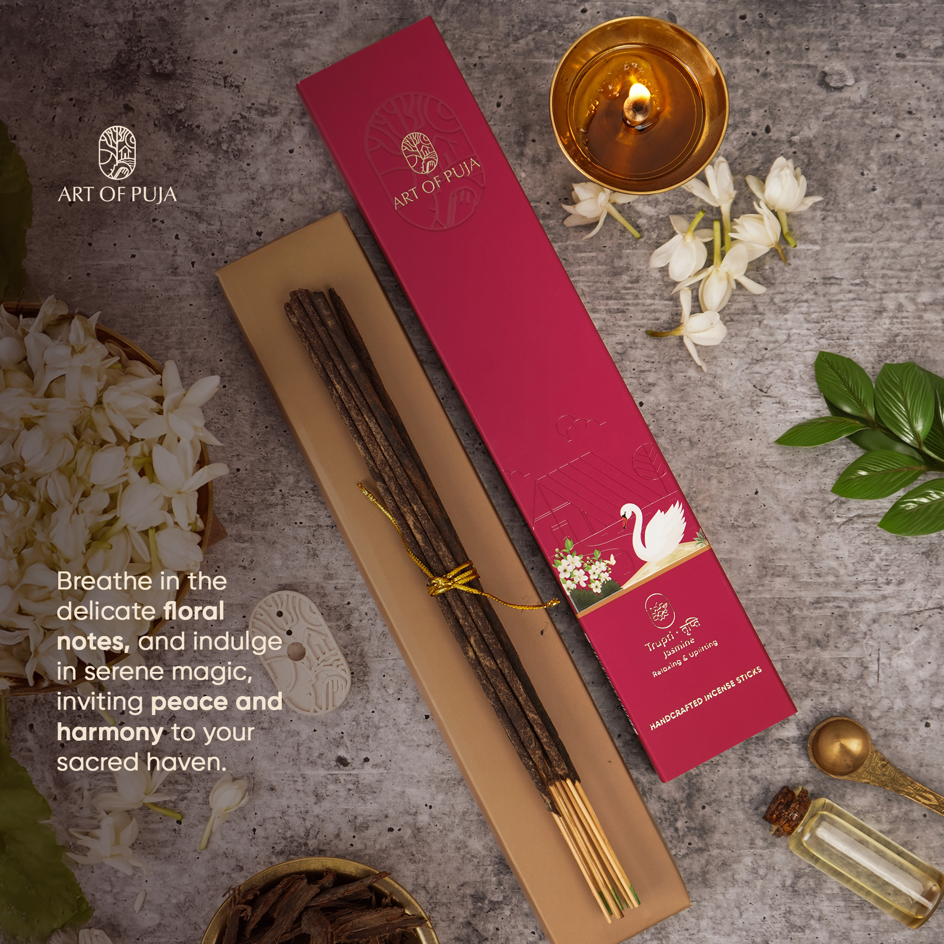 Art of Puja presents handcrafted jasmine incense sticks, where each stick is a fragrant masterpiece, imbued with the essence of purity and grace. Jasmine, a revered flower in ancient traditions, is renowned for its ability to soothe the mind and awaken the senses. Breathe in the delicate floral notes and allow them to foster a sacred communion between your inner spirit and the higher power. Experience a profound sense of tranquility as your spirit connects with something greater than yourself. Indulge in this serene magic, and let the worries of the world melt away, replaced by a sense of peace and harmony.