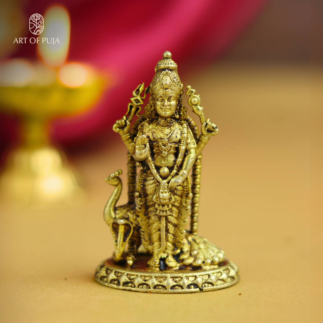 Bring home divine blessings with this exquisite brass idol of Lord Kartikeya (Murugan/Skanda), beautifully handcrafted by skilled Indian artisans. Known as the God of War, Victory, and Wisdom, Kartikeya is depicted seated gracefully with his vel (spear) and trishul, symbolizing the destruction of negativity and protection from evil. His blessing hand bestows peace, fortune, and courage, while his peacock mount represents triumph over pride and ego.