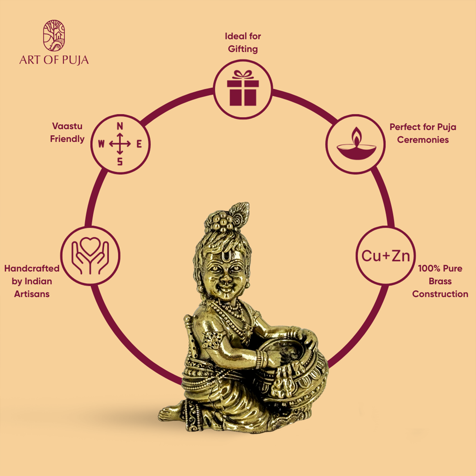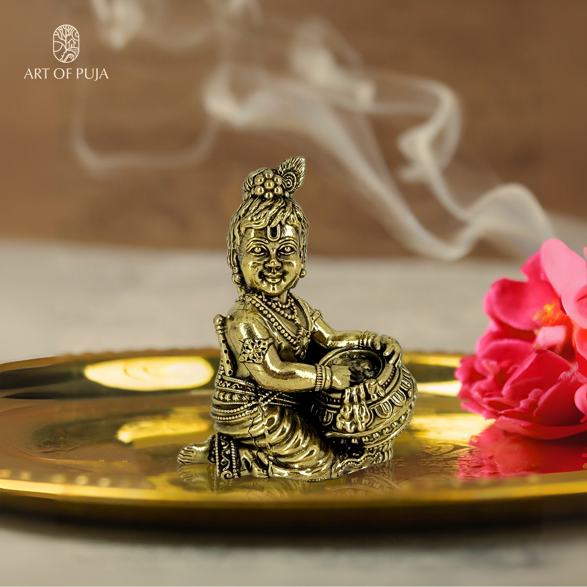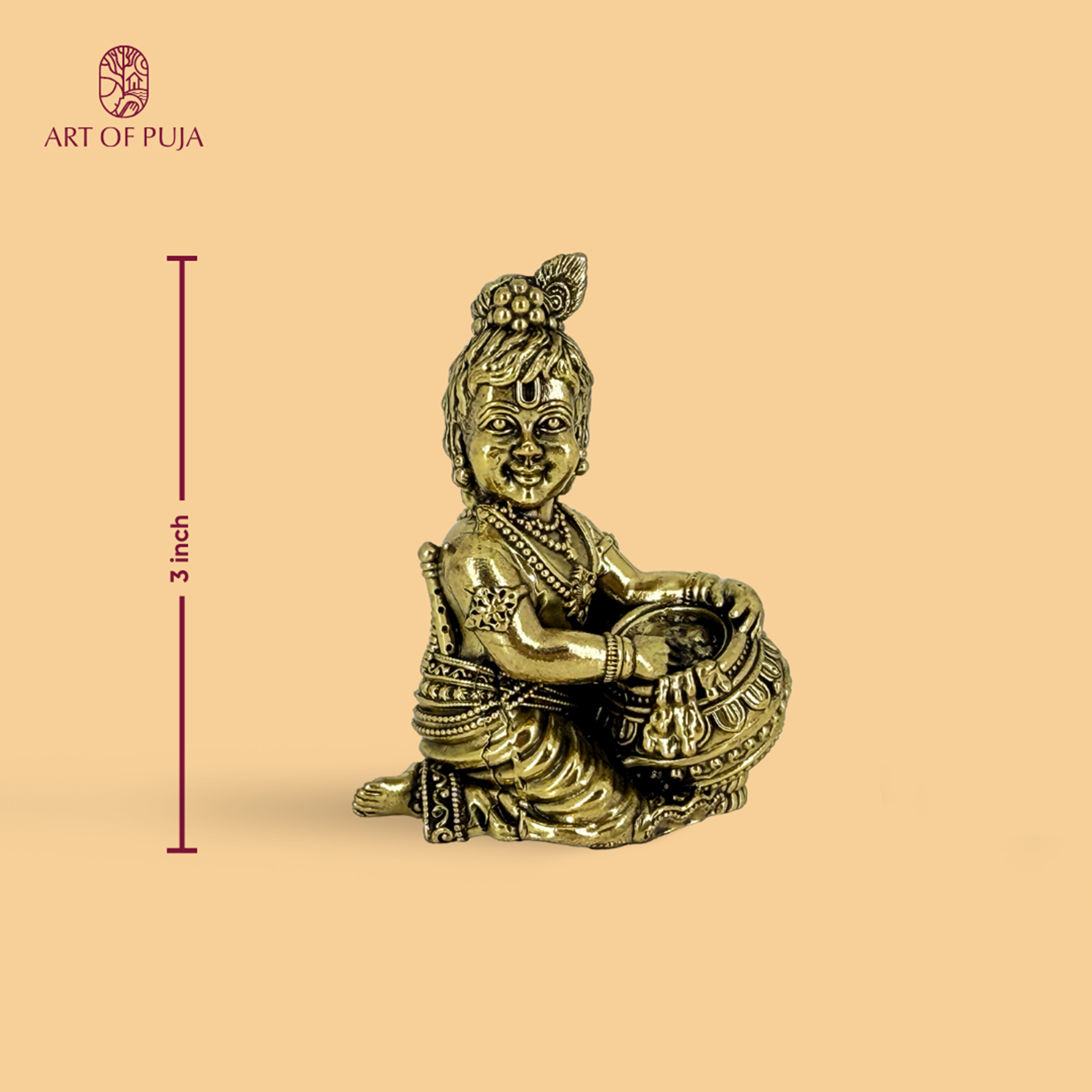Brass Laddu Gopal Idol | Bal Krishna Murti with Butter Pot | Baby Krishna Statue for Puja, Janmashtami & Gifting | 3 inch