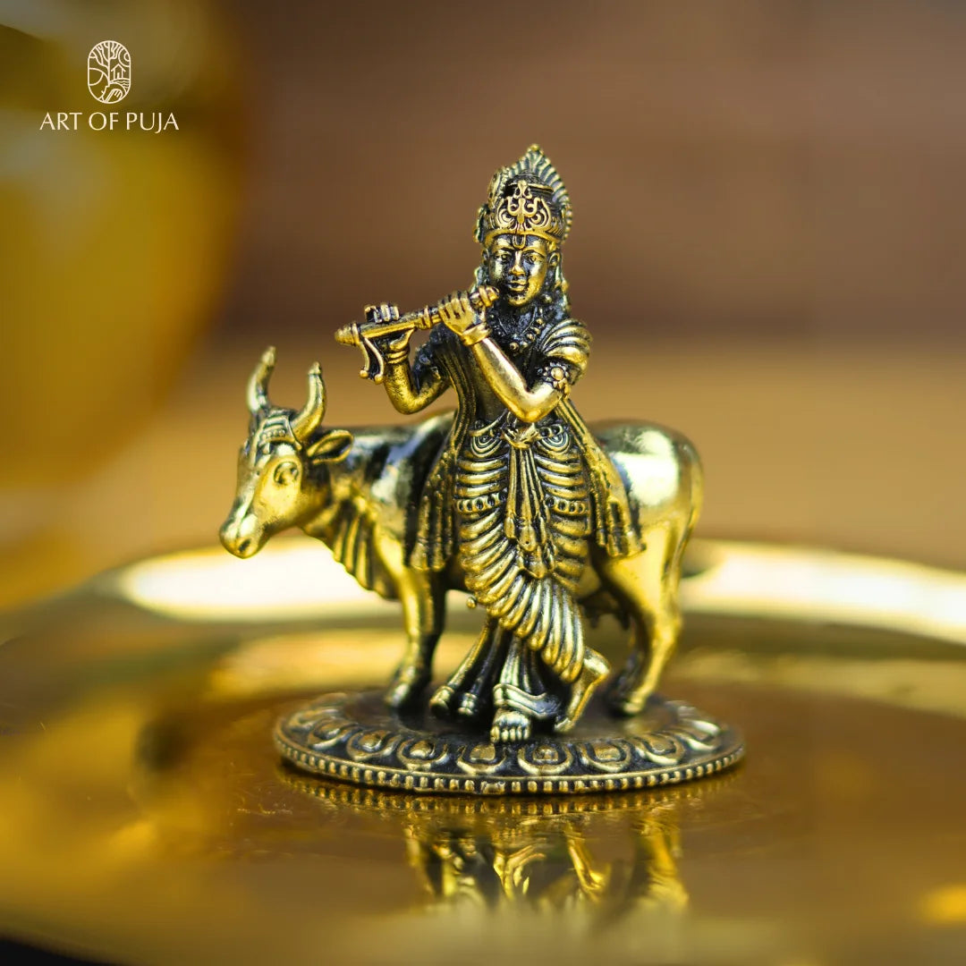 Brass Krishna with Cow Idol | Lord Krishna Murti Playing Flute with Nandi | Spiritual Statue for Puja, Home Temple & Gifting | 3 inch