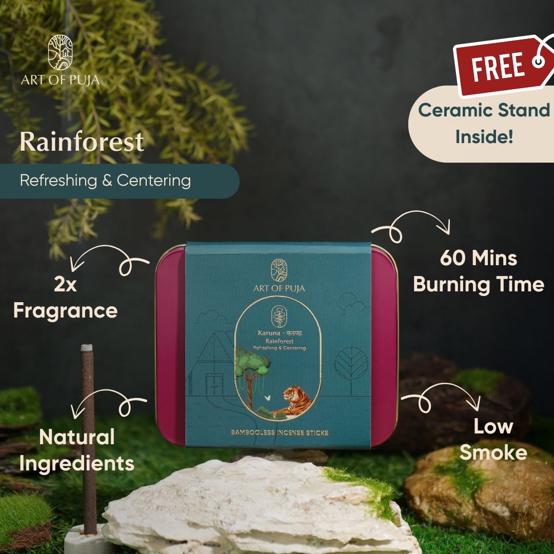 Discover the earthy haven of our Rainforest Bambooless Incense Sticks. Each stick is a portal to a lush, vibrant world, where exotic woods, tantalizing spices, and refreshing florals intertwine to create a sensory masterpiece. Allow the earthy, grounding notes to transport you to a tranquil oasis, where stress melts away and you strengthen your connection with the higher power. Experience a deep sense of relaxation as the invigorating top notes awaken your senses, leaving you feeling refreshed and rejuvenated. Let the spirit of the rainforest envelop you, creating a harmonious and uplifting atmosphere that nourishes your soul.
