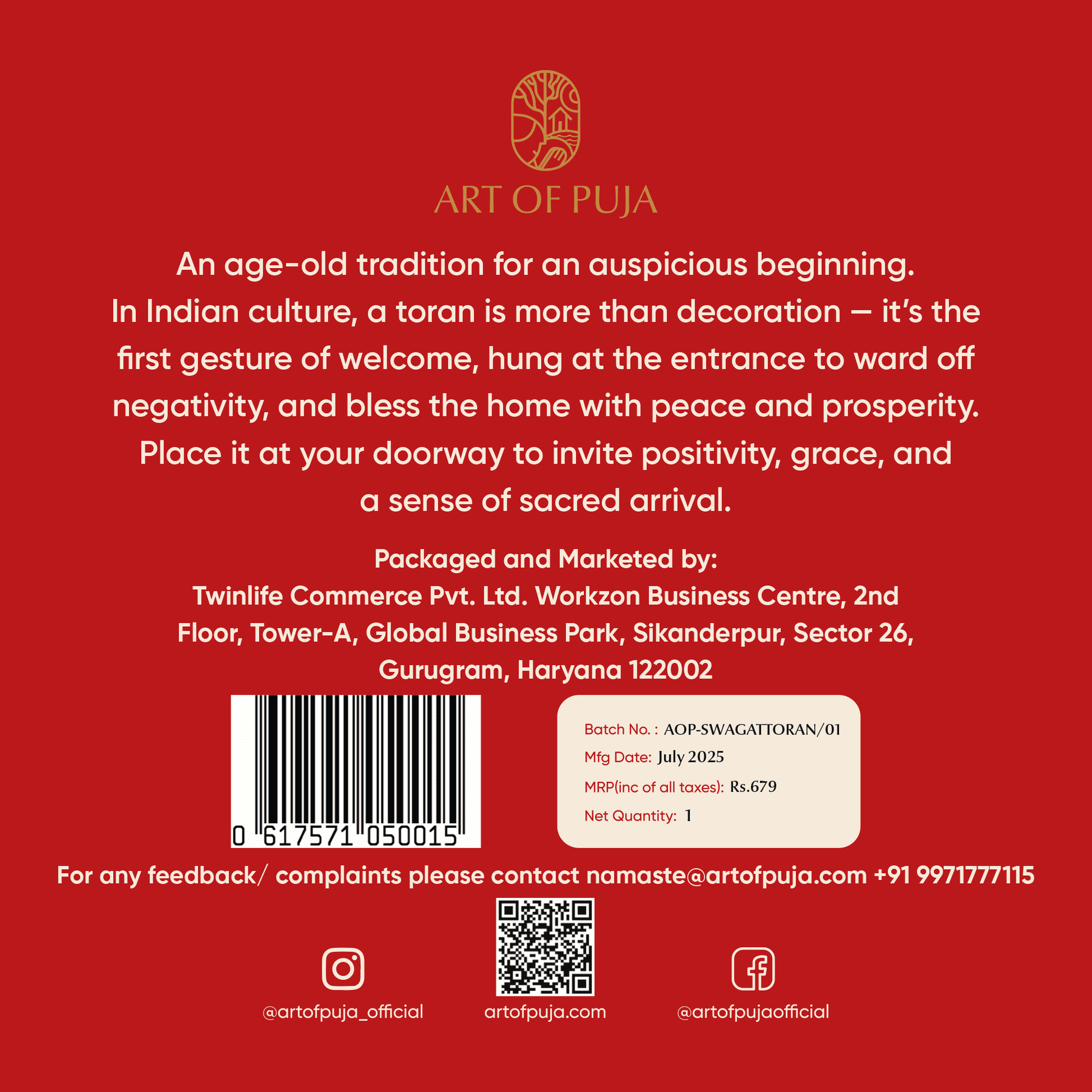 Return: Ensuring 100% customer satisfaction is our priority. If our products do not meet your expectations, please email us atnamaste@artofpuja.com. We will do our best to rectify the situation. Please keep in mind that refunds and returns are only applicable in instances of quality defects or if the product differs from its description.